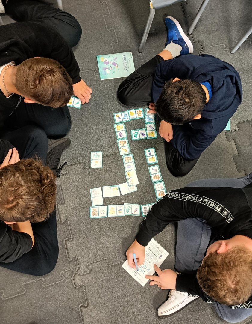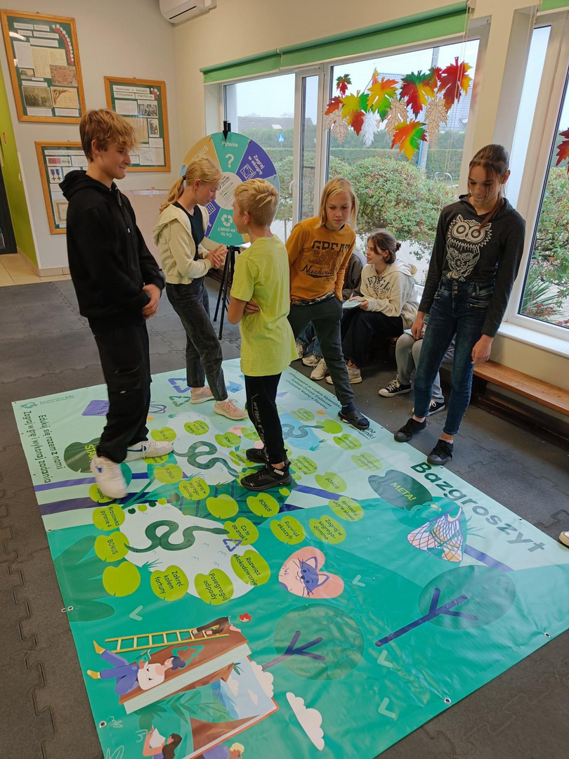 Podczas spotkań nie tylko słuchaliśmy, ale mogliśmy także sprawdzić swoją wiedzę. Łączyliśmy się w grupy i wybieraliśmy liderów, którzy następnie, w charakterze pionków, przemieszczali się po wielkiej planszy zgodnie ze wskazaniem oczek na kostce. Wszyscy rozwiiązywaliśmy zadania związane z ochroną środowiska. Każdy mógł wygrać drobny upominek - zakładkę do książki, temperówkę w kształcie kubła na śmieci lub grę.