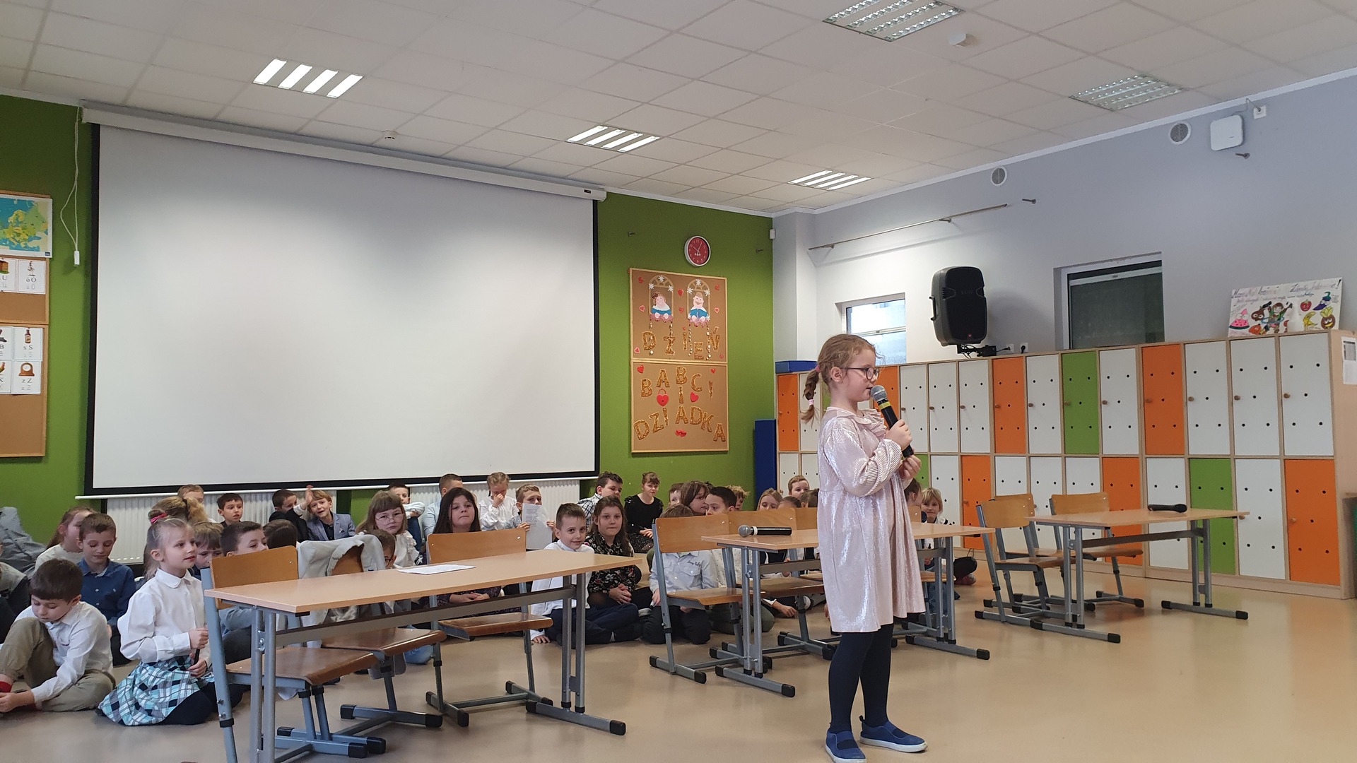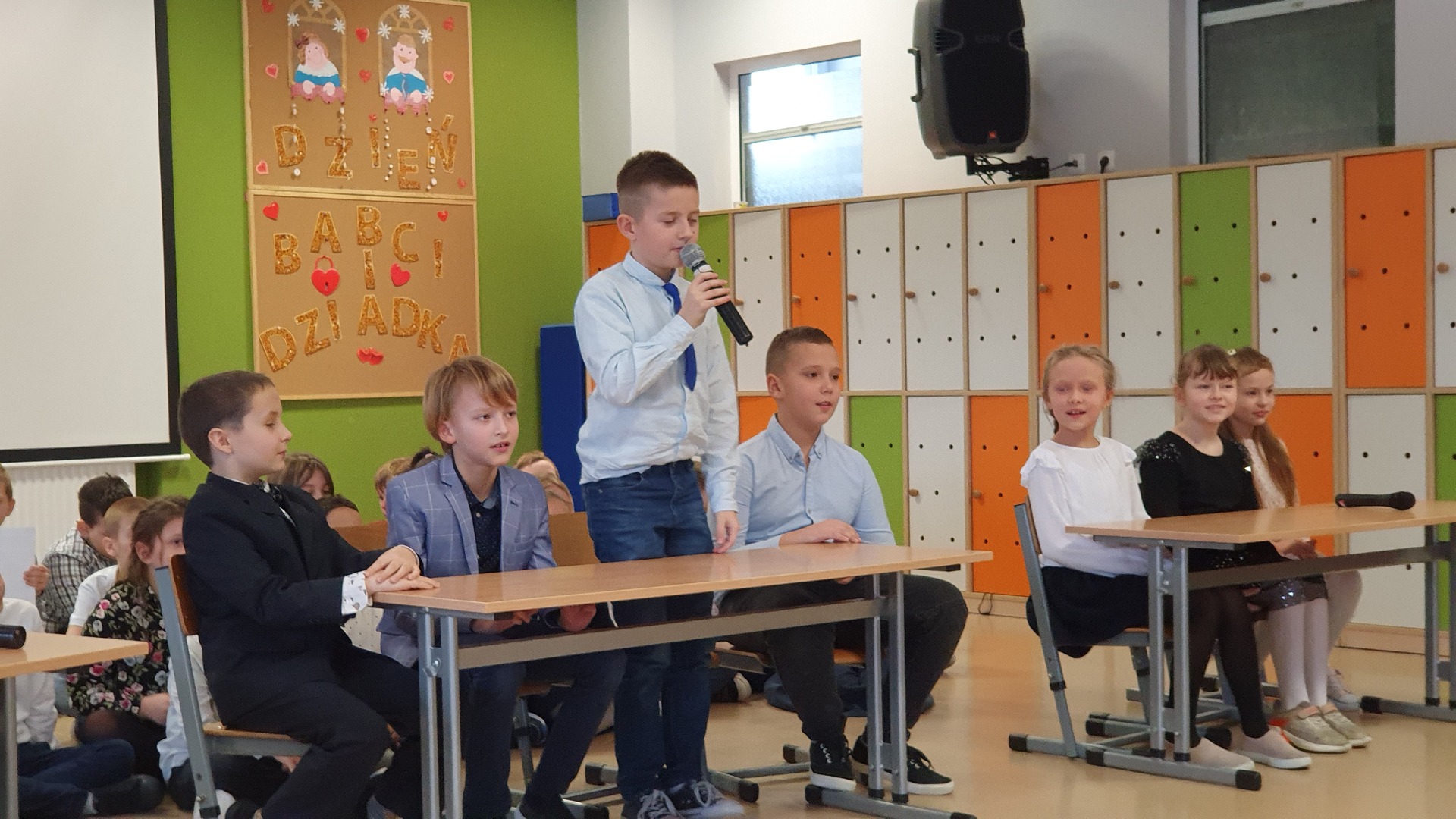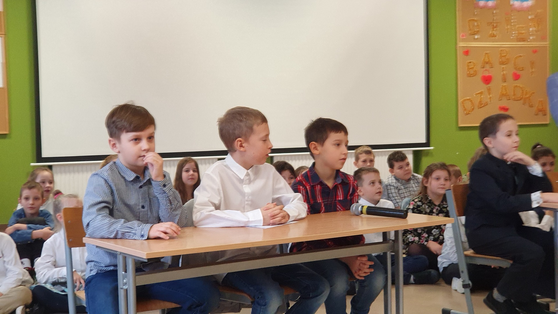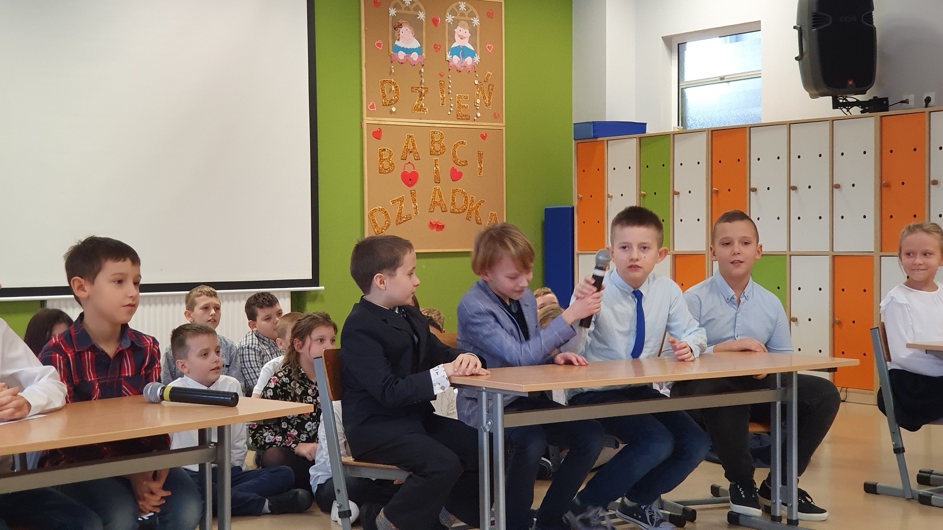 22 stycznia odbyła się w naszej szkole uroczystość dla Babć i Dziadków.W ten wyjątkowy styczniowy dzień dzieci z klas I-III przedstawiły program artystyczny w formie teleturnieju. Zabawne teksty pytań i odpowiedzi wzbogacone o piosenki podobały się dziadkom, którzy nagradzali swoje wnuki gromkimi brawami. Mali artyści z przejęciem odtwarzali swoje role, a czcigodni goście ze wzruszeniem odbierali czułe słowa. Dzieci zaśpiewały „Sto lat”, a następnie obdarowano dziadków upominkami. Spotkanie zakończyło się wspólnym poczęstunkiem i pamiątkowymi zdjęciami .