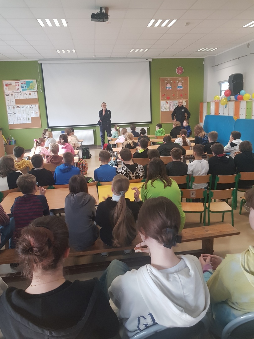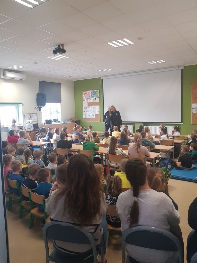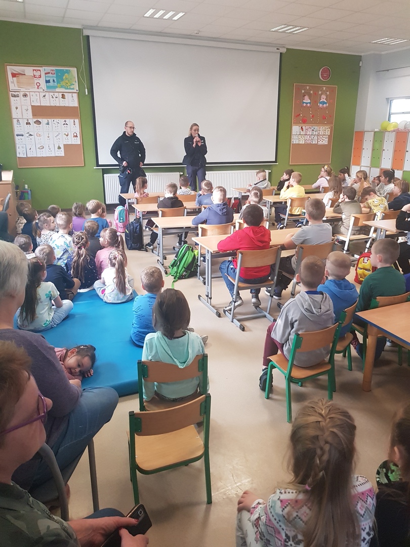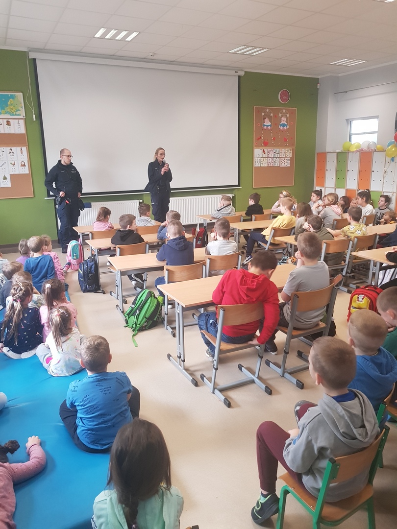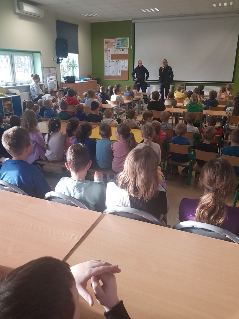 Ferie zimowe w naszym województwie rozpoczynają się dopiero 12 lutego, a ponieważ zależy nam, aby były bezpieczne , dlatego dzisiaj odbyło się spotkanie profilaktyczno- edukacyjne z funkcjonariuszami policji dla uczniów klas I- VIII oraz oddziałów przedszkolnych. Dla wszystkich najważniejsze jest bezpieczeństwo najmłodszych, dlatego przez cały rok policjanci z Komendy Powiatowej Policji w Obornikach prowadzą wiele różnych działań, aby dzieci i młodzież z naszej szkoły mogły uczyć się, bawić i wypoczywać bezpiecznie. Podczas dzisiejszej prelekcji policjanci przypomnieli o zagrożeniach mogących pojawić się podczas ferii. Zwrócili uwagę na niebezpieczeństwa czyhające na dzieci podczas uprawiania sportów zimowych oraz gier i zabaw na świeżym powietrzu. Przypomnieli zasady postępowania wobec obcej osoby: „Nie wpuszczaj do domu…”, „Nie rozmawiaj…”, „Nie ufaj…”, ale również uświadomili dzieciom, do kogo mogą się zwrócić o pomoc w przypadku zgubienia się w obcym miejscu. Ważnym elementem spotkania była rozmowa o przestrzeganiu zasad poruszania się po drogach, nawet tych mniej uczęszczanych. Zwrócili szczególną uwagę na podstawowe wyposażenie roweru oraz elementy odblaskowe , tak niezbędne po zmroku. Funkcjonariusze przypomnieli dzieciom numer telefonu alarmowego i omówili sposób udzielenia informacji o zdarzeniu wymagającym pomocy ze strony służb ratowniczych.