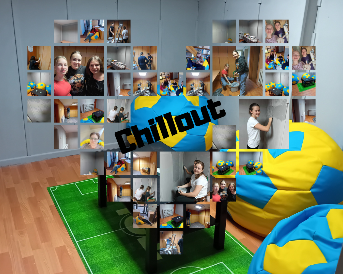 Informujemy, że już coraz bliżej otwarcia uczniowskiego kącika chilloutu. Do tej pory udało się zakupić pufy w kształcie piłek, pomalować wpsólnymi siłami: Pana woźnego, opiekuna SU oraz Zarządu SU ściany i sufit "naszego pokoju wyciszeń". Dziękujemy także jednej z mam za podarowanie piłakarskiego dywanika. Niestety ze względu na dłuuugie terminy czekamy na pomoc zaprzyjaźnionego Pana stolarza, który obiecał upiększyć nam ściany o tablicę magnetyczną. Poniżej zdjęcia naszych dotychczasowych dokonań.