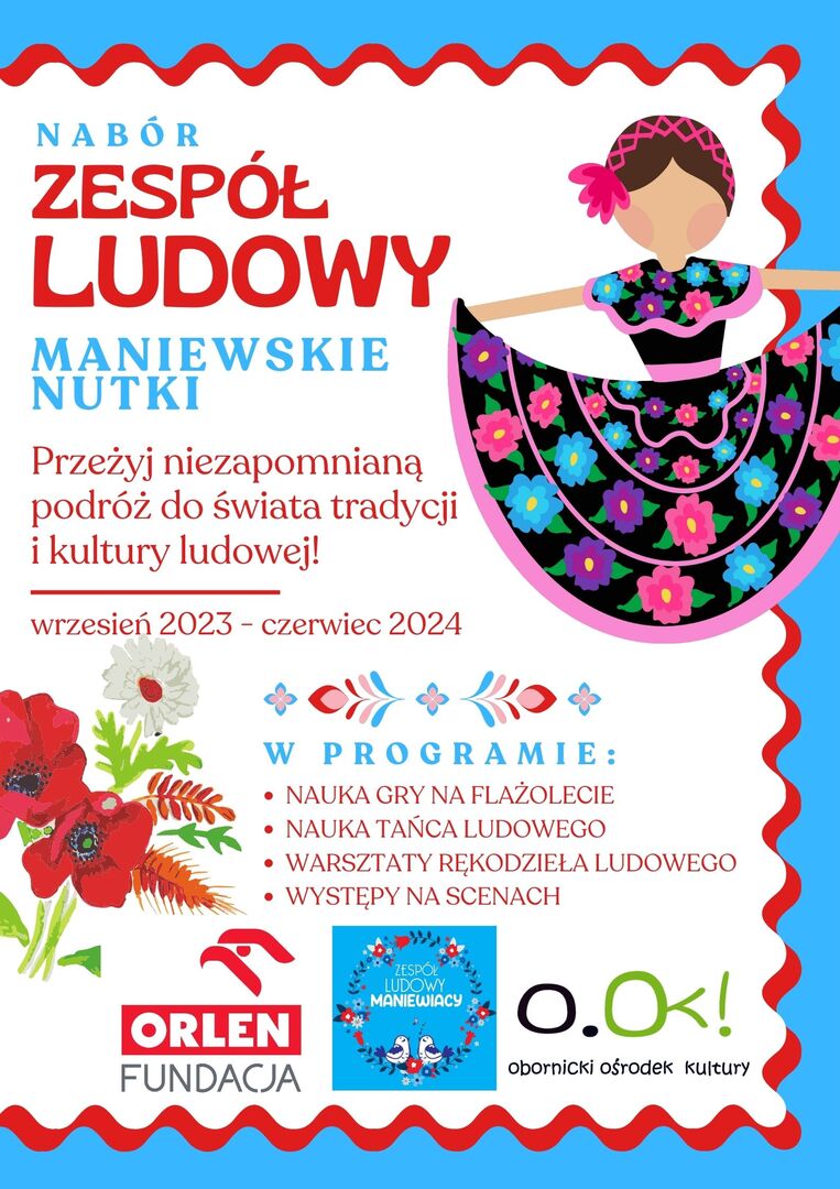 Dzięki Fundacji ORLEN, Obornickiemu Ośrodkowi Kultury i Zespołowi Ludowemu Maniewiacy już od września możesz przystąpić do zespołu tańca i gry na flażolecie!