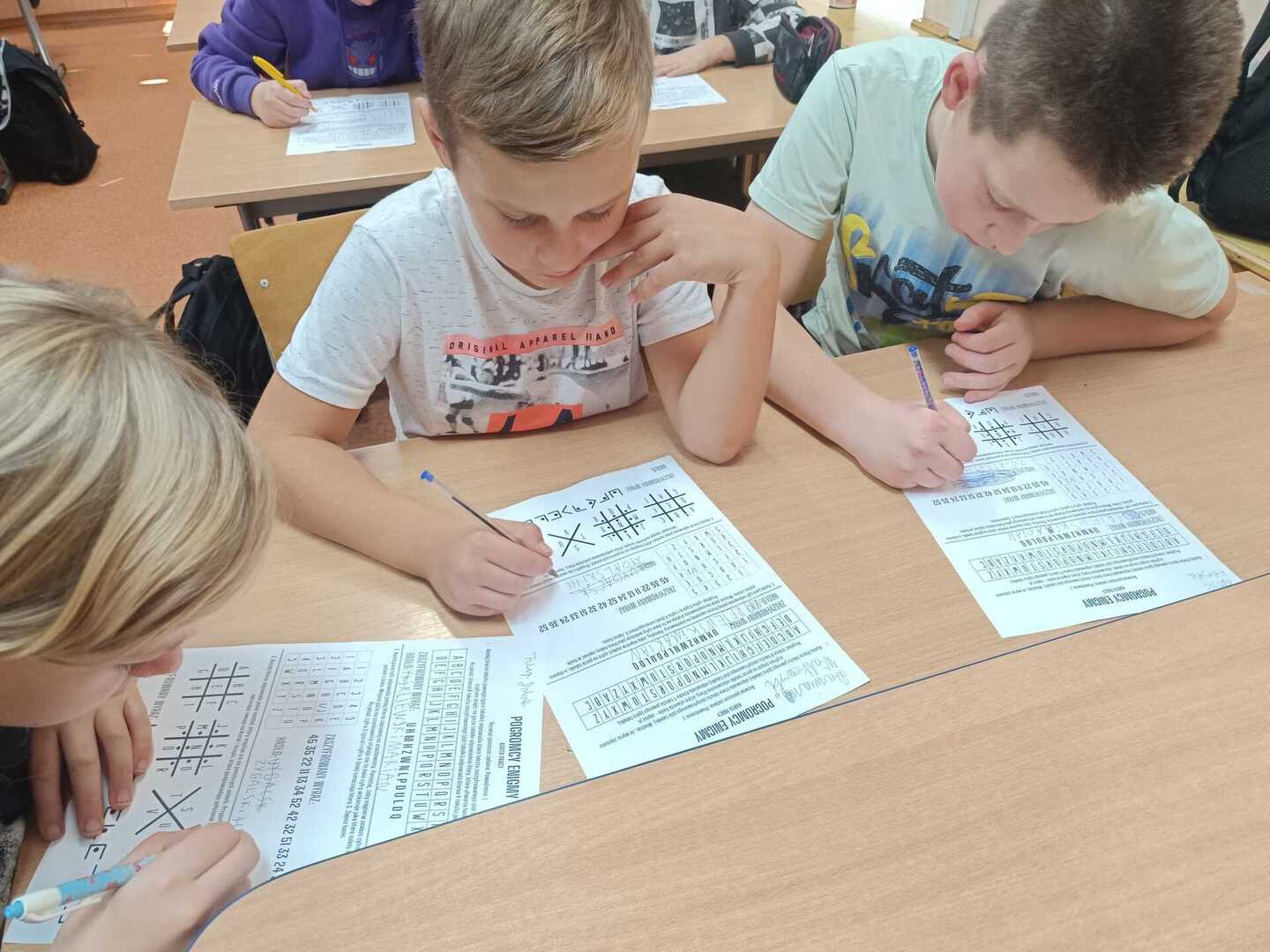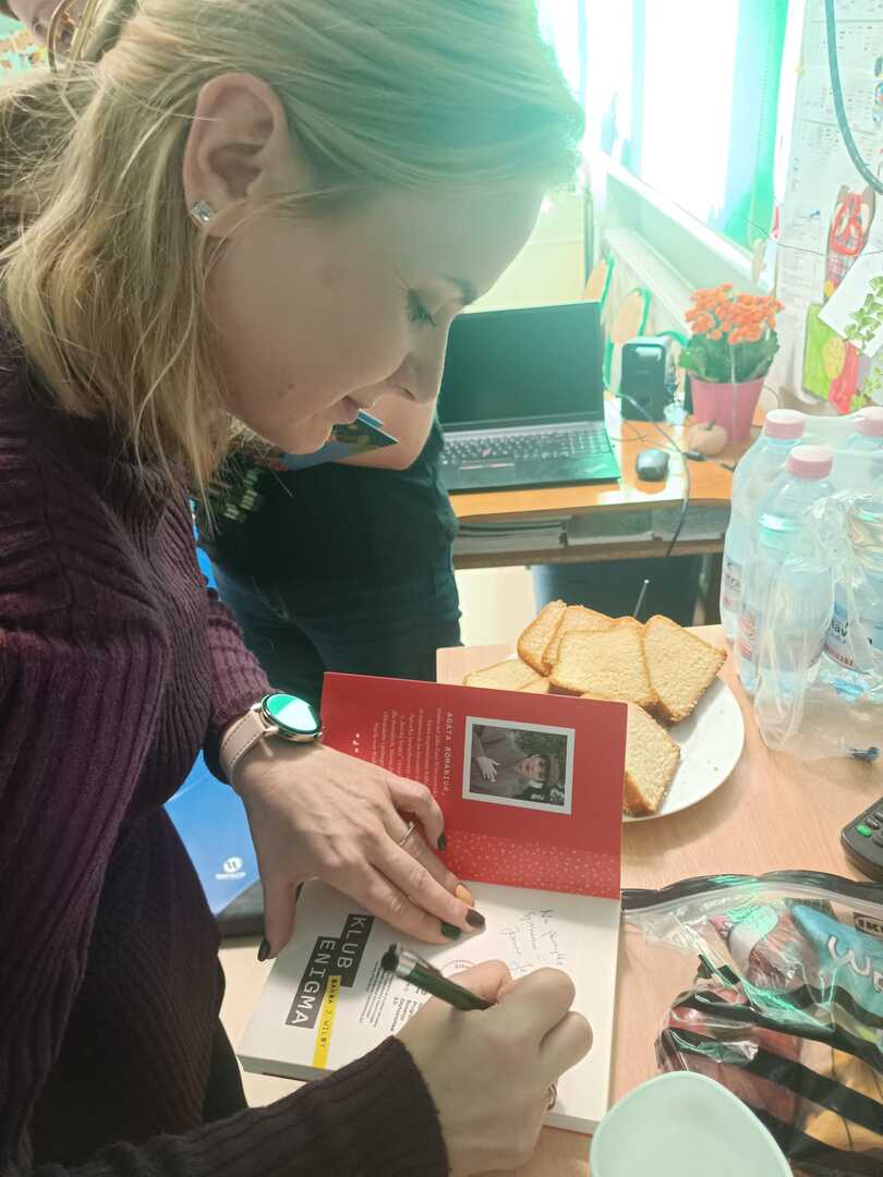 Czwarto- i piątoklasiści zapoznali się z bohaterami "Klubu Enigma" Agaty Romaniuk. Zastanawiali się, jak wyglądają członkowie bandy z Wildy, porównywali ilustracje oraz kodowali własne imiona. Spotkanie dla starszyzny szkolnej (klas VI-VIII) dotyczyło natomiast zawodów związanych z książką. Okazało się, że z wydawnictwem współpracują nie tylko autorzy i redaktorzy, ale też tłumacze, korektorzy, ilustratorzy, graficy, drukarze i wiele innych osób, o których raczej nie myślimy, czytając książkę.