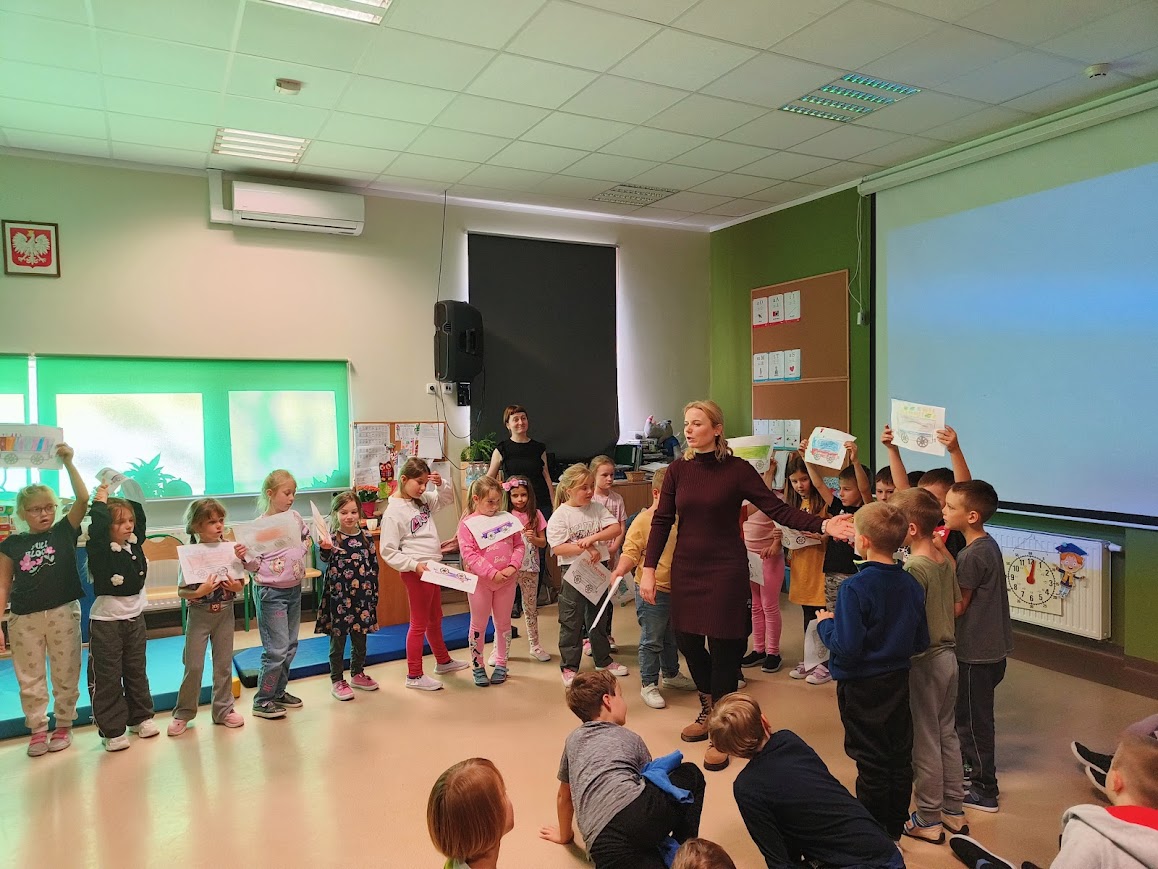 Uczniowie klas I-III rozmawiali o książkach Michała Rusinka ("Szalik", "Pan Słowik"). Opowieści o Wisławie (Ichnie) Szymborskiej i Julianie (Julku) Tuwimie stały sie inspiracją do zabaw w zapełnianie wagonów lokomotywy ze słynnego wiersza (było ich ze czterdzieści - pierwszaki wiedziały, co się w nich mieści), dzierganie szalika ze słów (drugoklasiści plątali nitki-wyrazy w taki sposób, że ostatnia litera poprzedniego słowa stawała się pierwszą następnego) oraz tworzenia zwariowanej opowieści o czarownicy (uczniowie trzeciej klasy losowali przymiotniki, które następnie wstawiali do opowiadania).