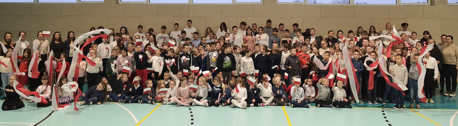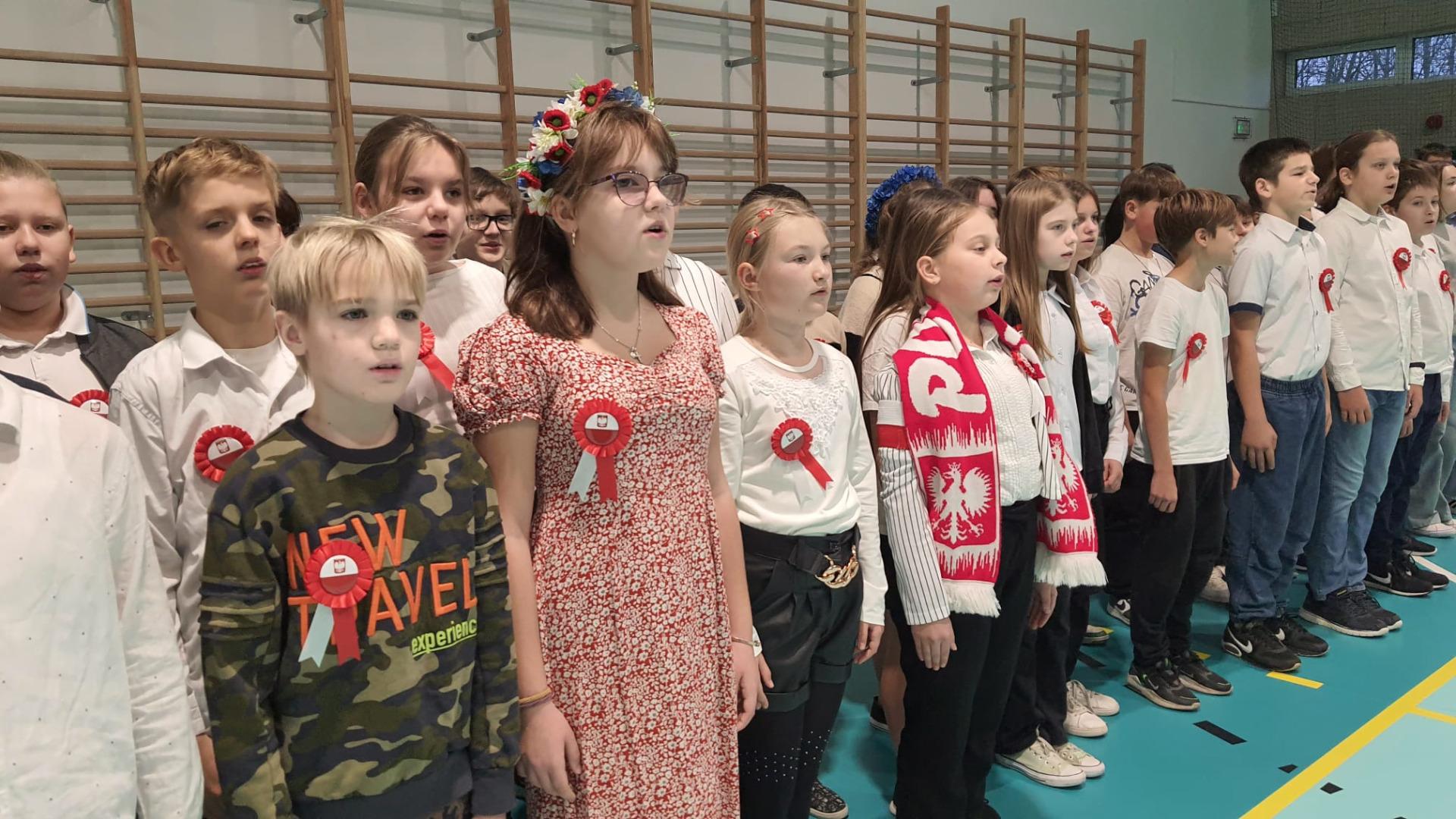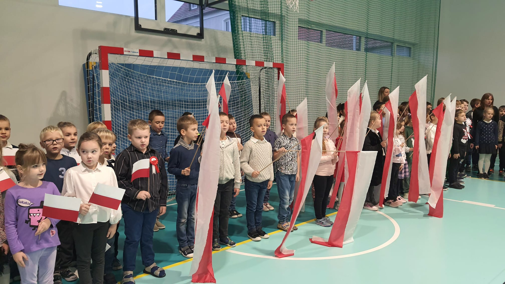 Dziś podczas pierwszej lekcji przedszkolaki oraz uczniowie wraz z nauczycielami zebrali się w sali gimnastycznej, by wspólnie zamanifestować swój patriotyzm.