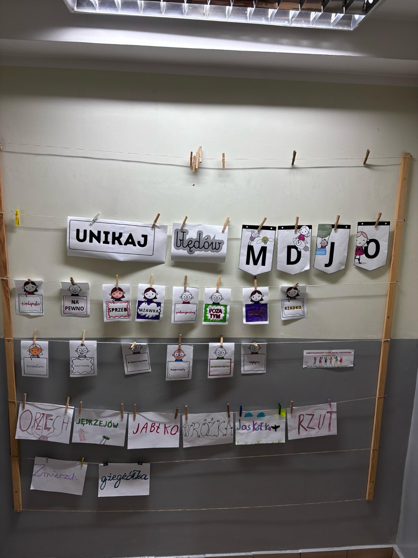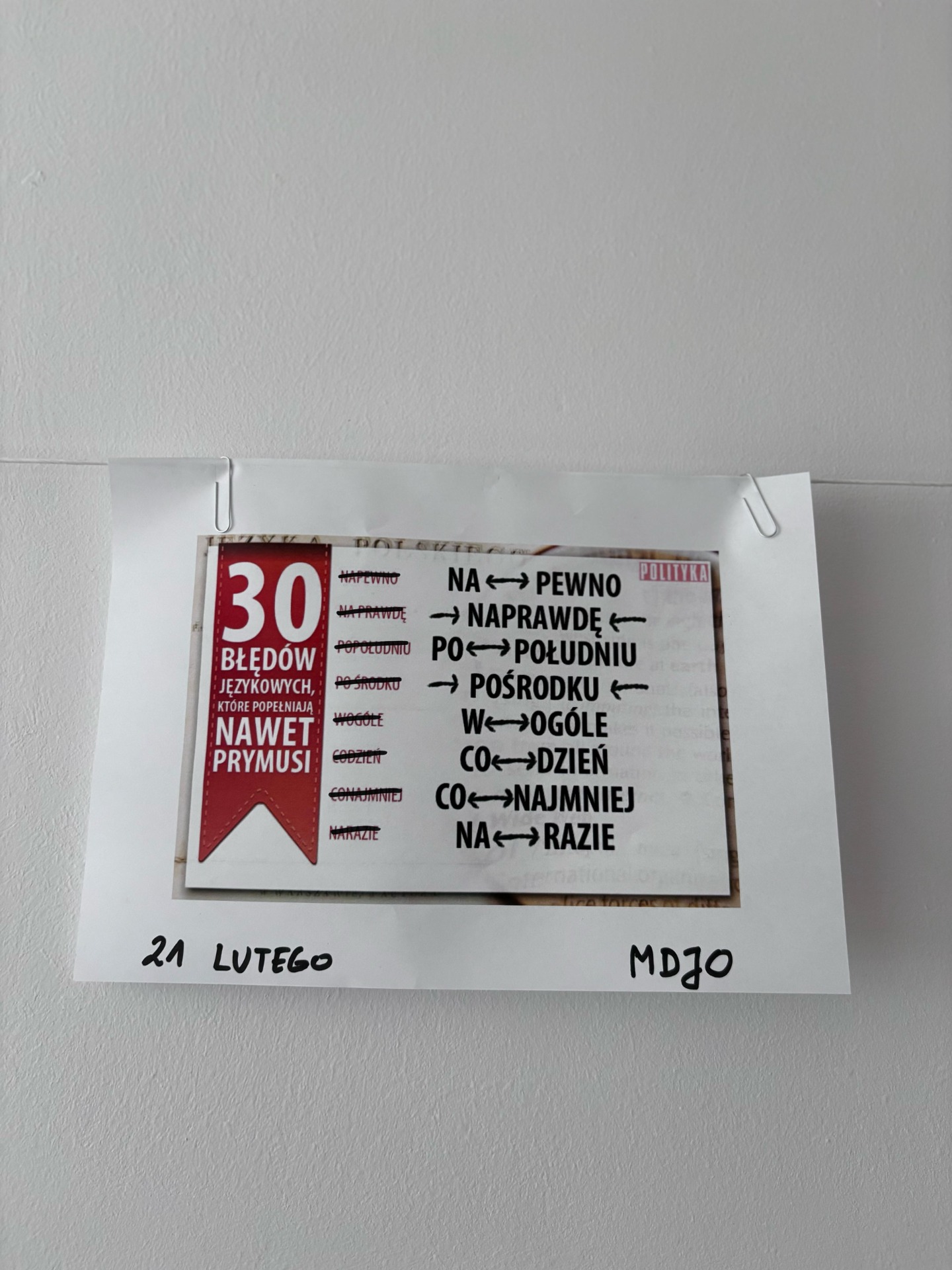Na korytarzach zawisły okolicznościowe plakaty. Gazetka i liczne plansze przestrzegały przed błędami językowymi. Uczniowie korzystali z fiszek rozwieszonych na ścianach, by ocalić od zapomnienia rzadziej używane wyrazy.