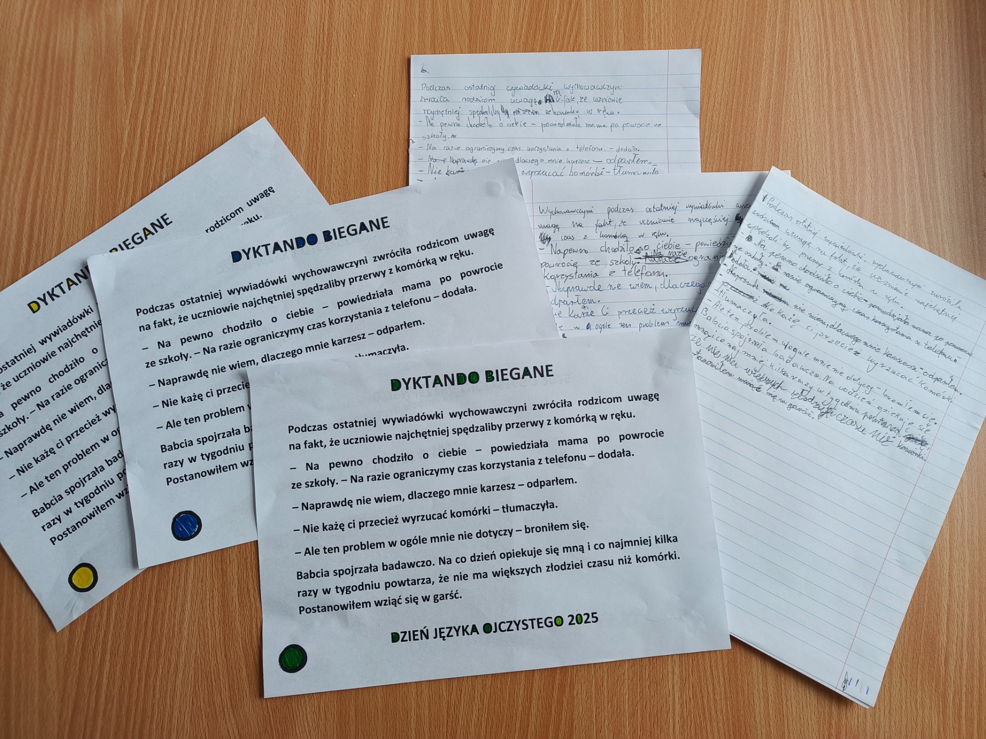 Punktem kulminacyjnym obchodów MDJO było dyktando biegane, w którym wzięły udział trzy miedzyklasowe zespoły. Uczestnicy musieli wykazać się sprawnością fizyczną, spostrzegawczością, refleksem oraz umiejętnościami językowymi. Ostatecznie wygrała drużyna żółta, która popełniła tylko jeden poważny błąd (warto nadmienić, że wkradł się on także do prac pozostałych grup). Chodzi o zapis: ,,na co dzień".