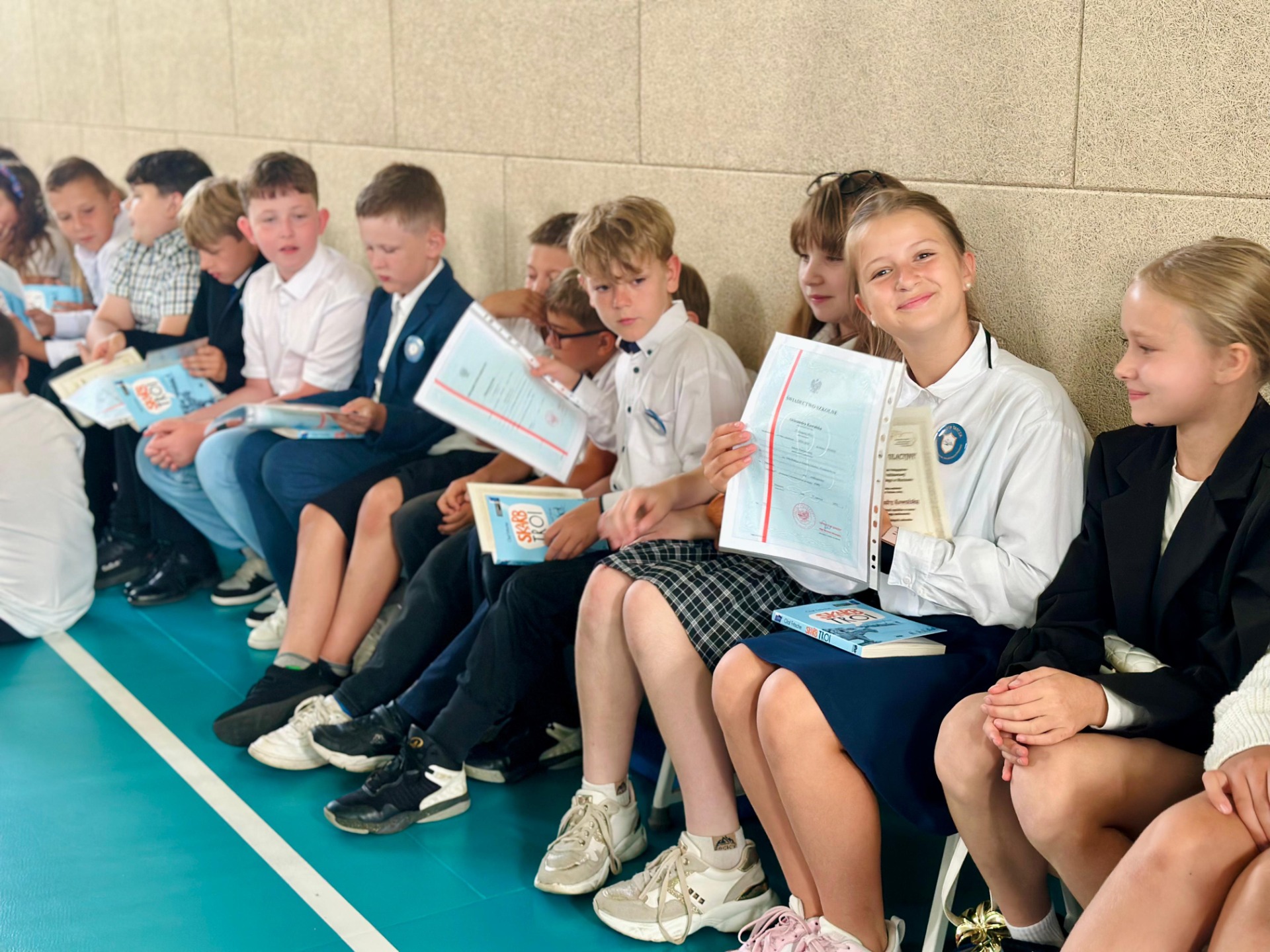 Podczas uroczystości wyróżniono także uczniów biorących udział w konkursach przedmiotowych i artystycznych, podkreślając ich zaangażowanie i rozwijanie pasji. Klasa 4 z dumą odebrała swoje pierwsze karty rowerowe, natomiast uczniowie klasy 3 – karty pływackie, potwierdzające ich umiejętności zdobyte podczas zajęć.