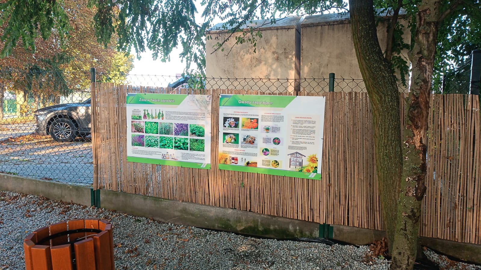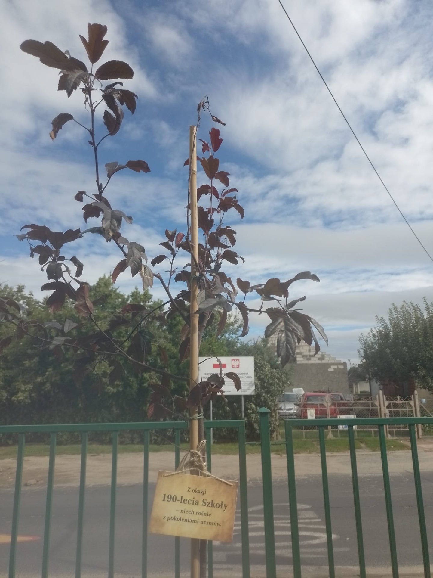 Przekraczając furtkę, zwróćcie uwagę na zasadzone po prawej stronie krzewy oraz drzewko. Te rośliny otrzymaliśmy od gości, którzy zaszczycili nas swą obecnością podczas jubileuszu 190-lecia. Pod oknami sali przedszkolnej już w czerwcu wymalowano białe orły szybujące wśród chmur. Teraz malowidła dopełnione zostały trawami. O zielony zagajnik oraz skrzynie z ziołami, warzywami i kwiatami dbają uczniowie najmłodszych klas pod opieką Pani Jadwigi Majchrzak-Zagrodnik.