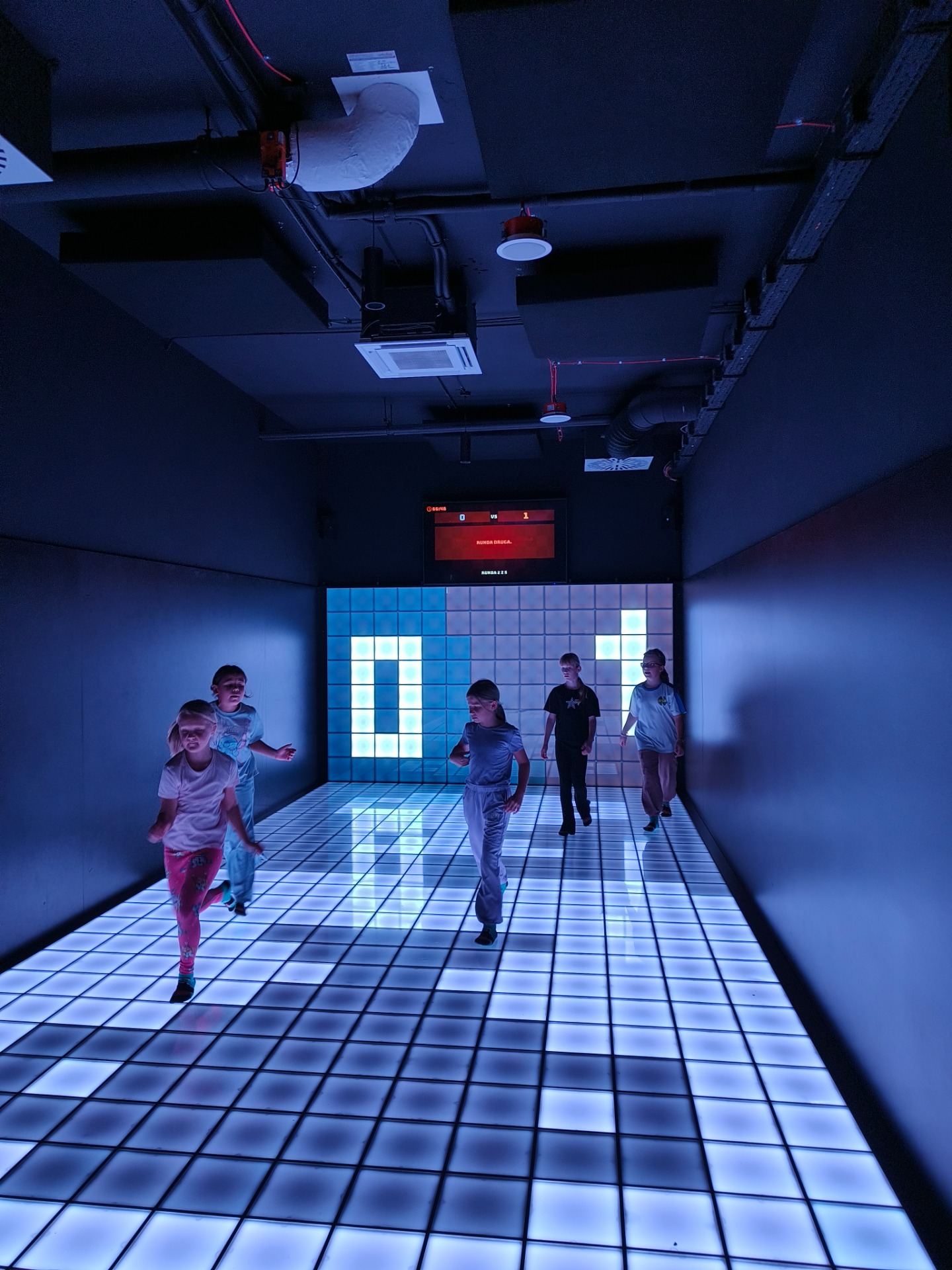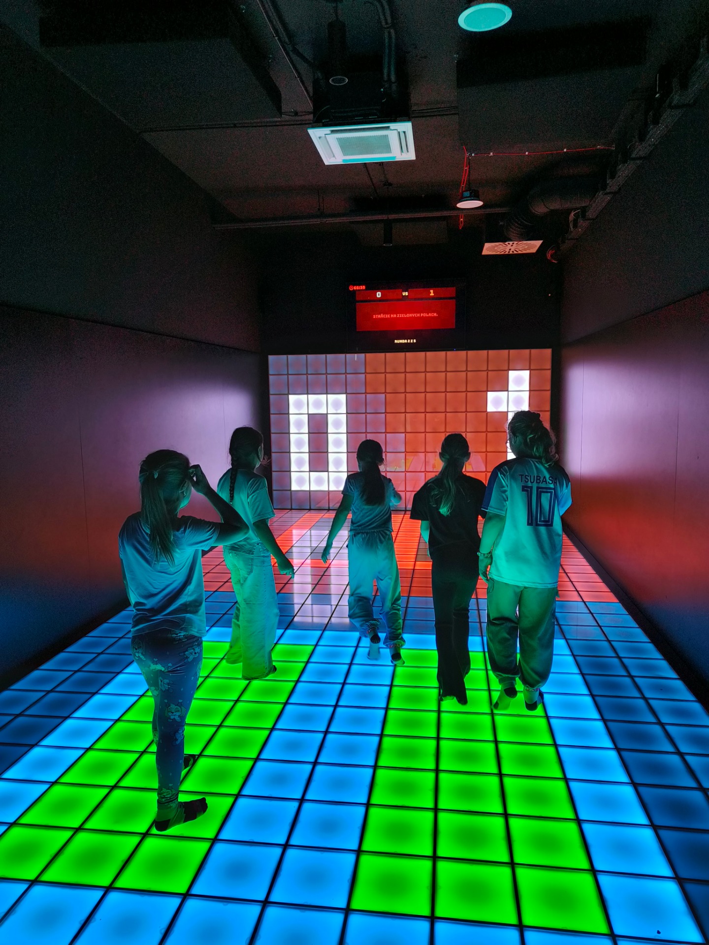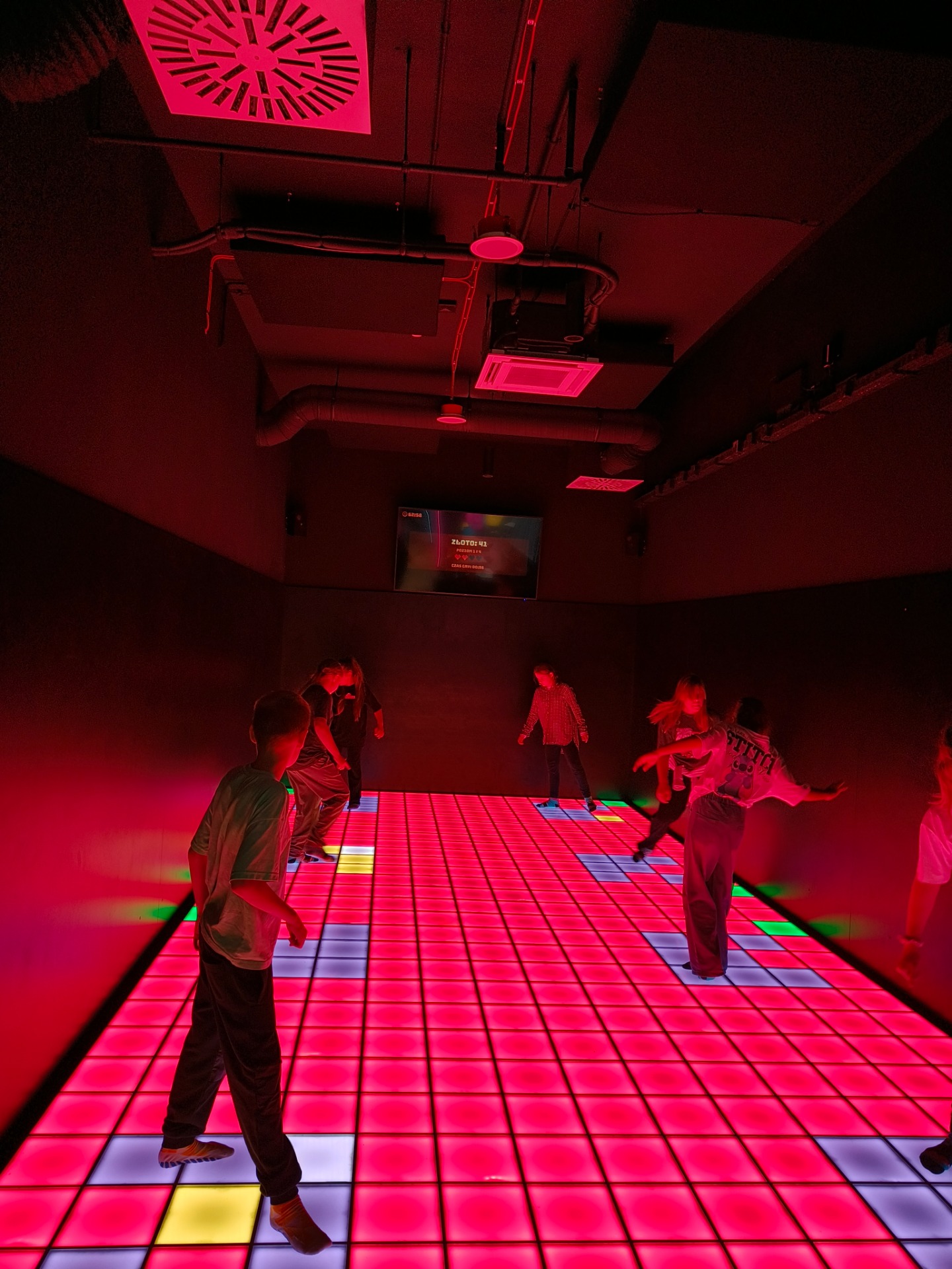 Pierwszym punktem programu były wygibasy w interaktywnej sali zabaw PixelXL. Trudno opisać to doświadczenie - człowiek ma wrażenie, że przeniósł się do gry komputerowej. Skakanie po kolorowych polach wymaga dobrego refleksu i sprawności fizycznej.