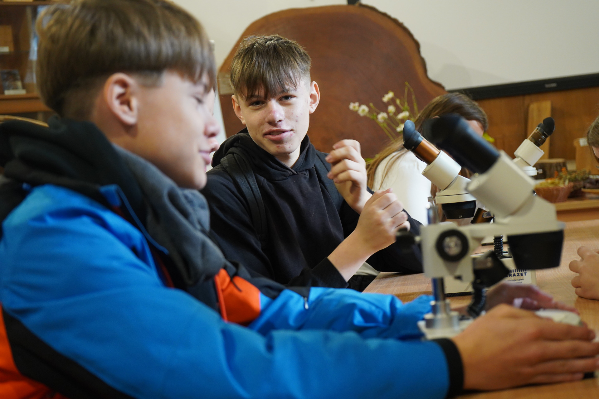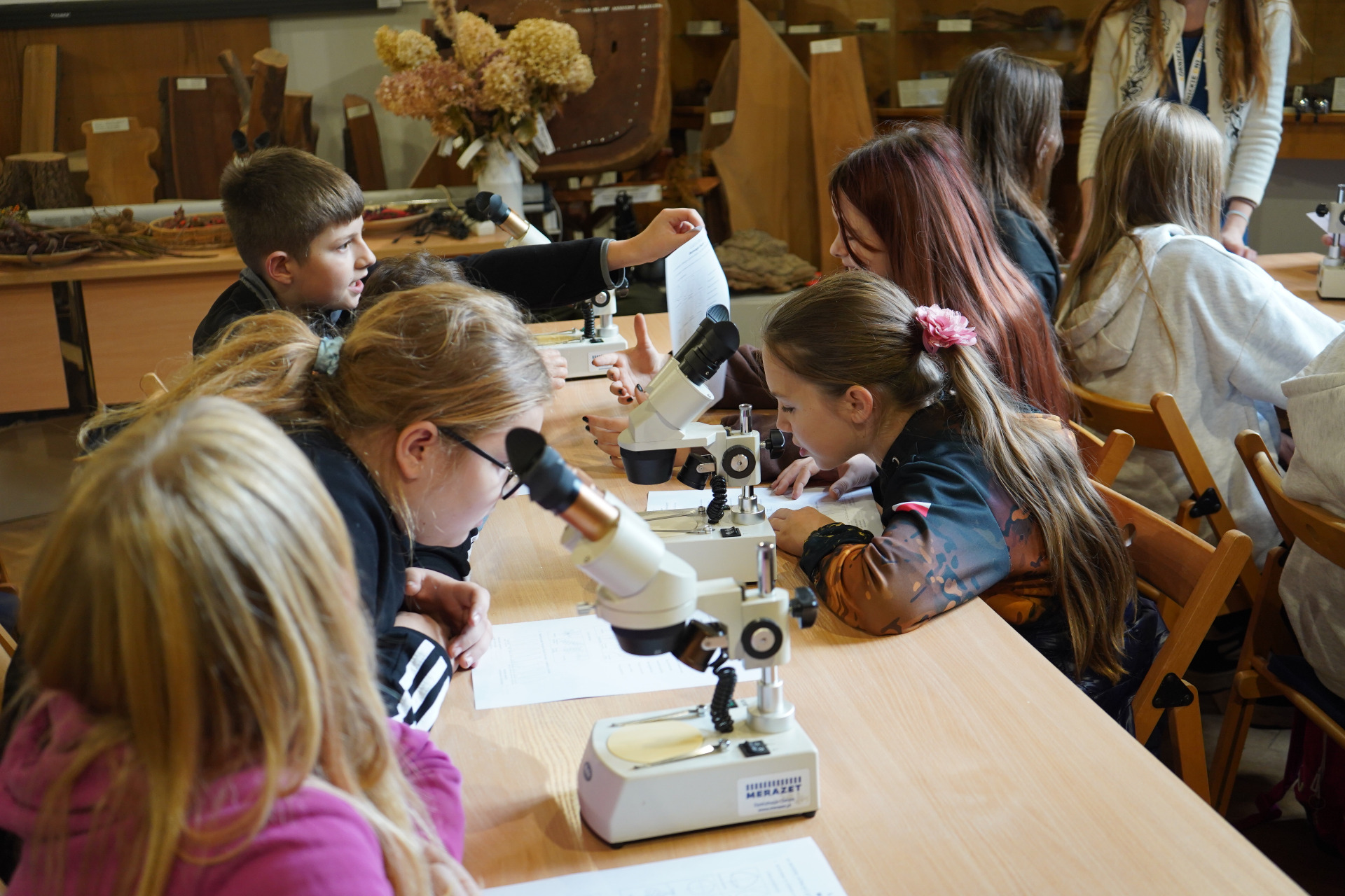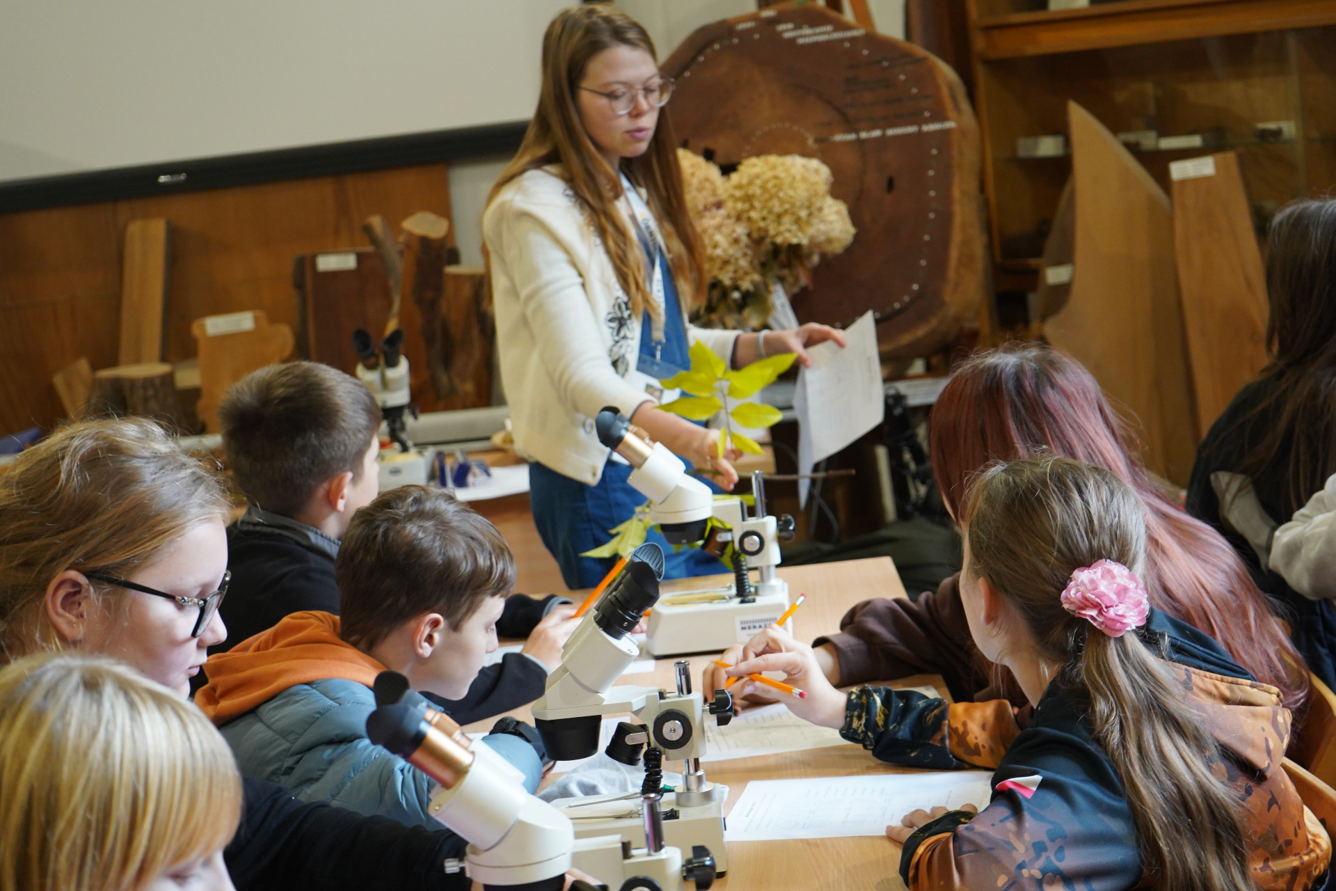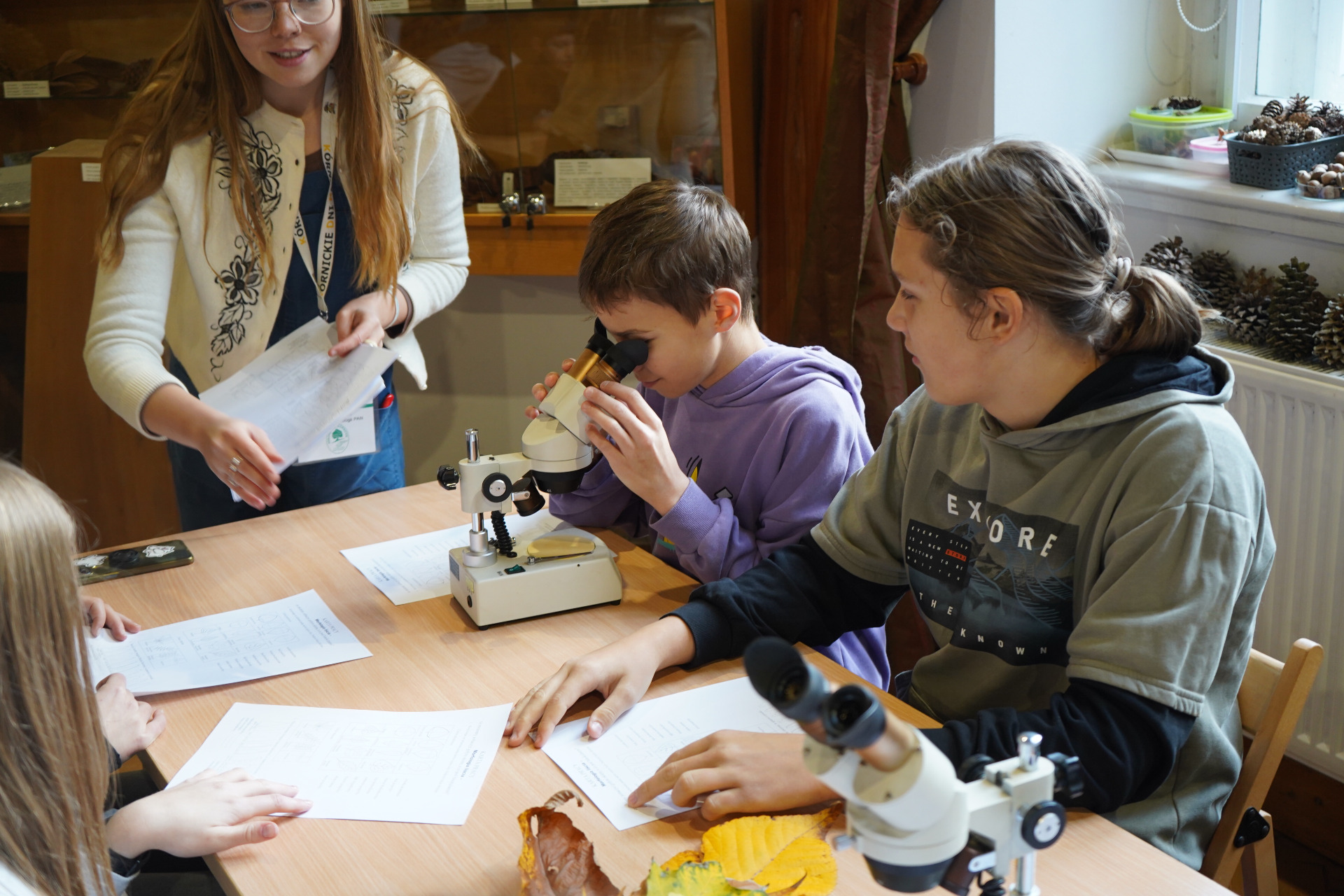 Po spacerze uczestnicy wzięli udział w zajęciach praktycznych – pracując z mikroskopami, obserwowali liście i drobne owady, ucząc się, jak wygląda świat przyrody w skali mikro.