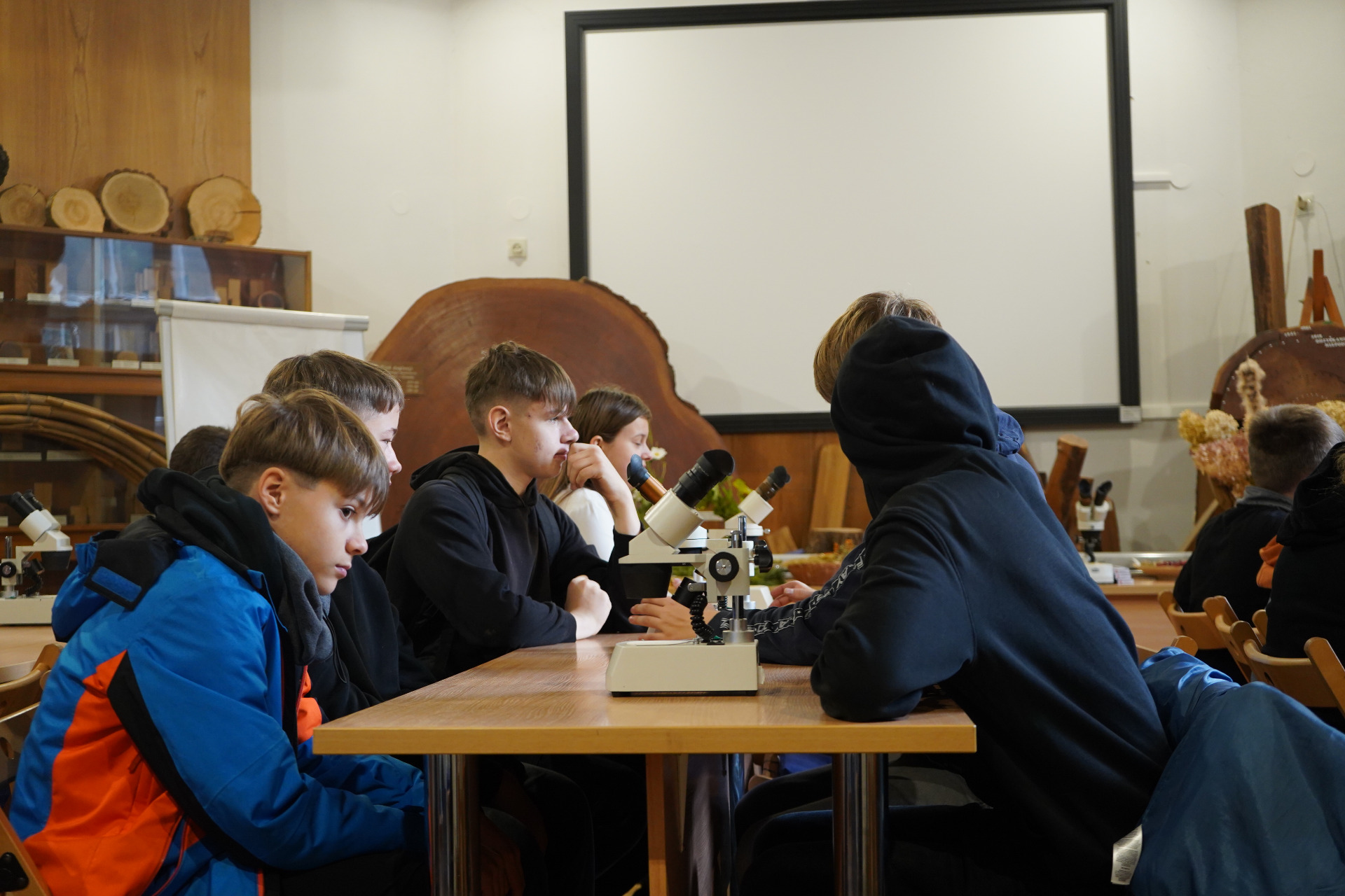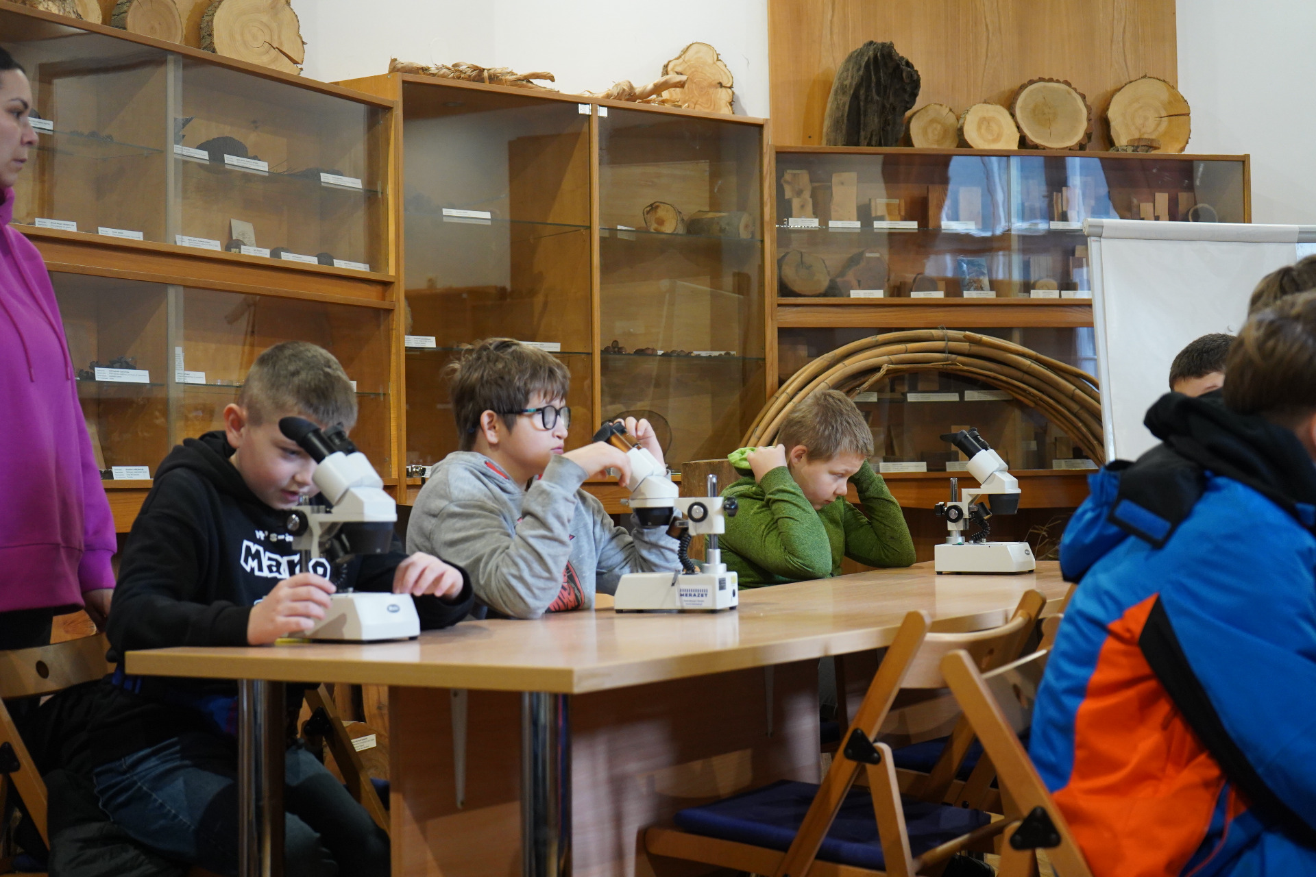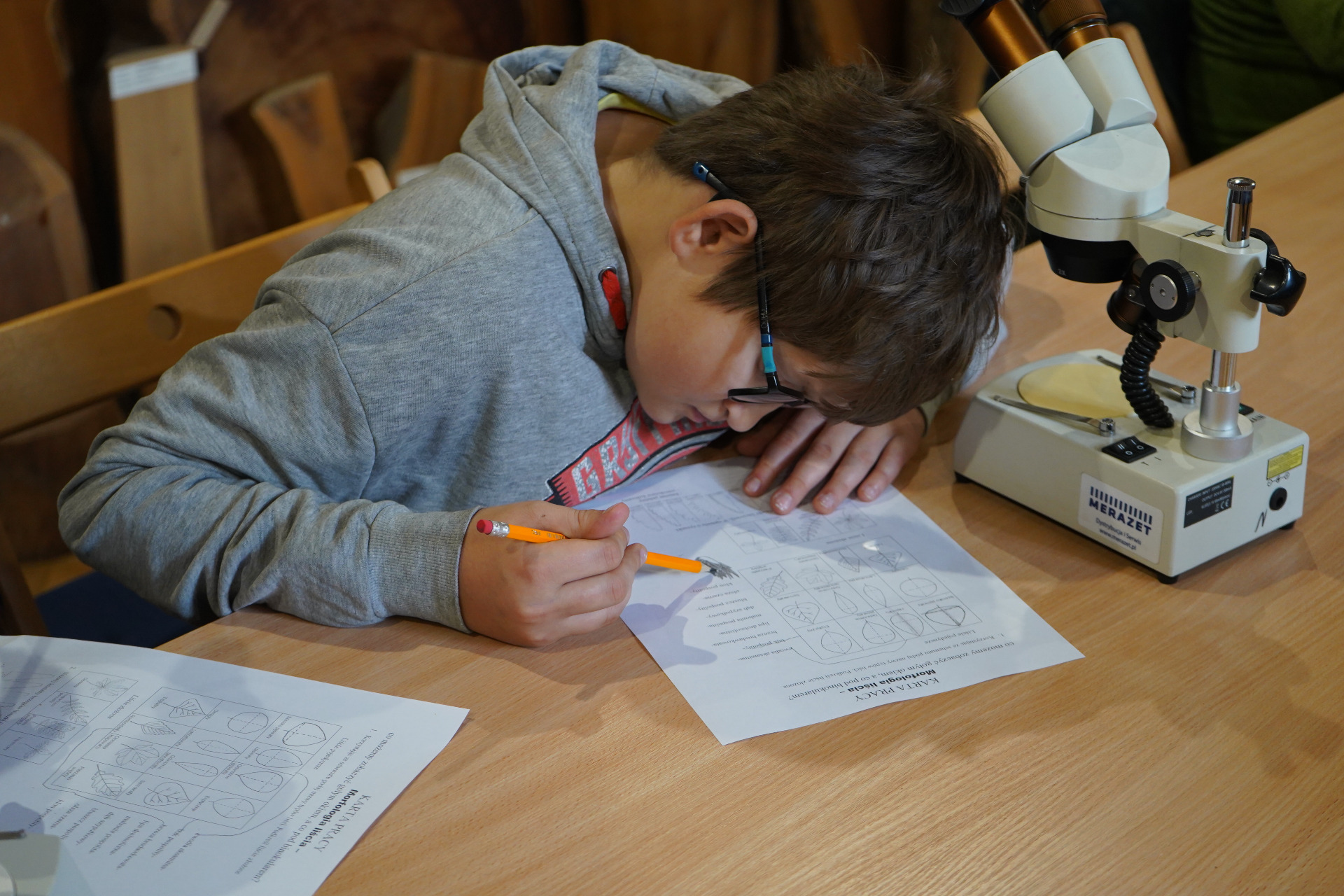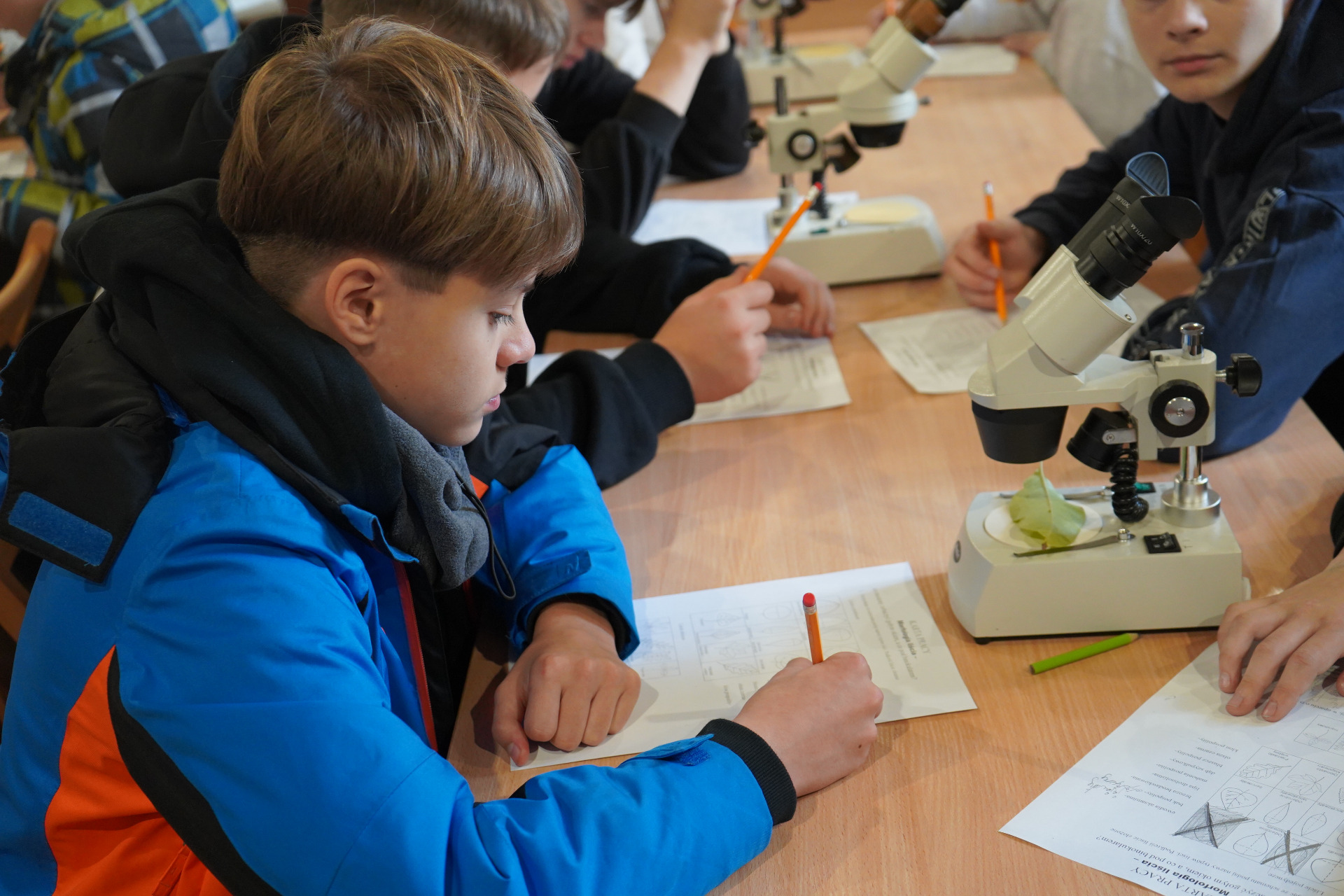 Po spacerze uczestnicy wzięli udział w zajęciach praktycznych – pracując z mikroskopami, obserwowali liście i drobne owady, ucząc się, jak wygląda świat przyrody w skali mikro.