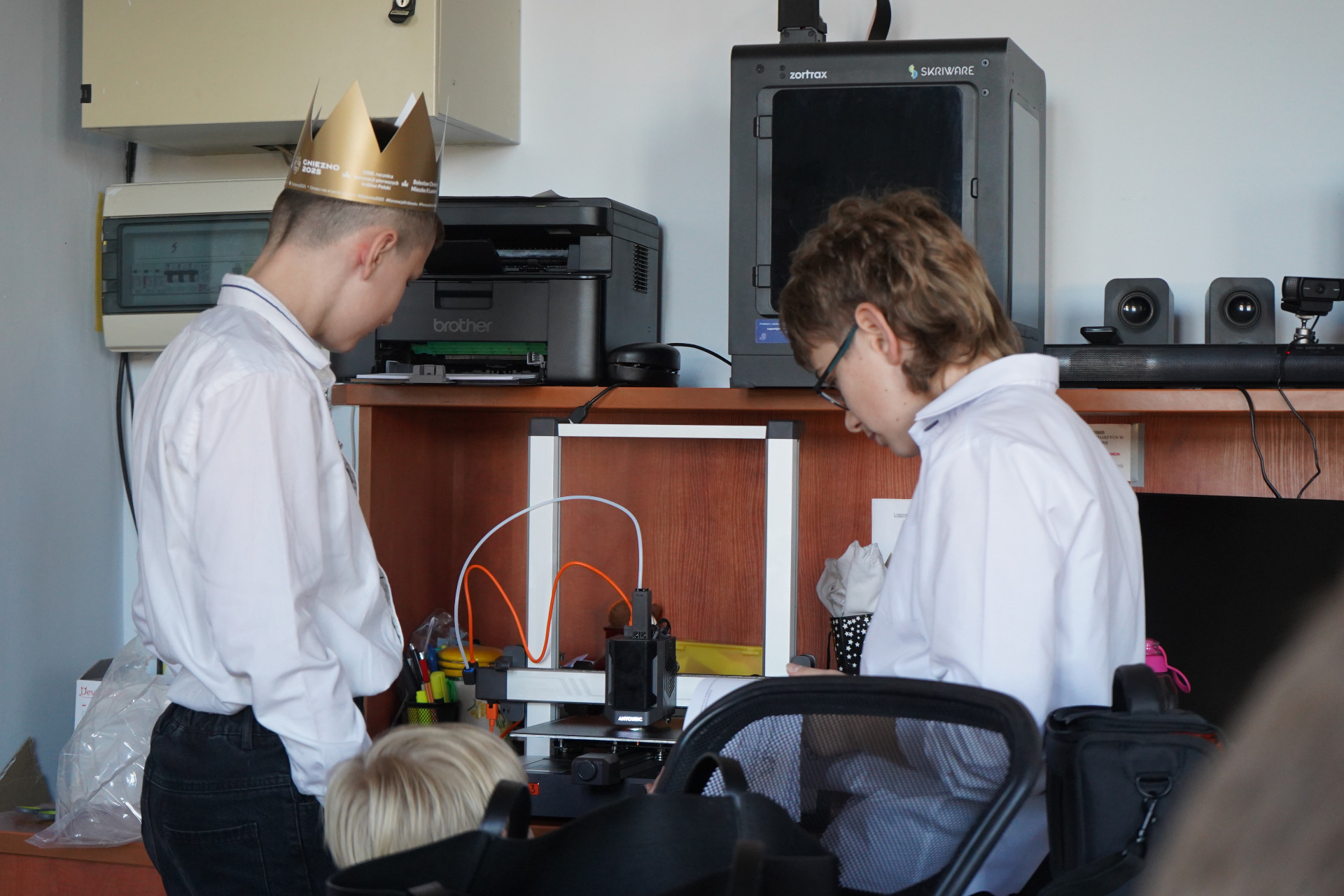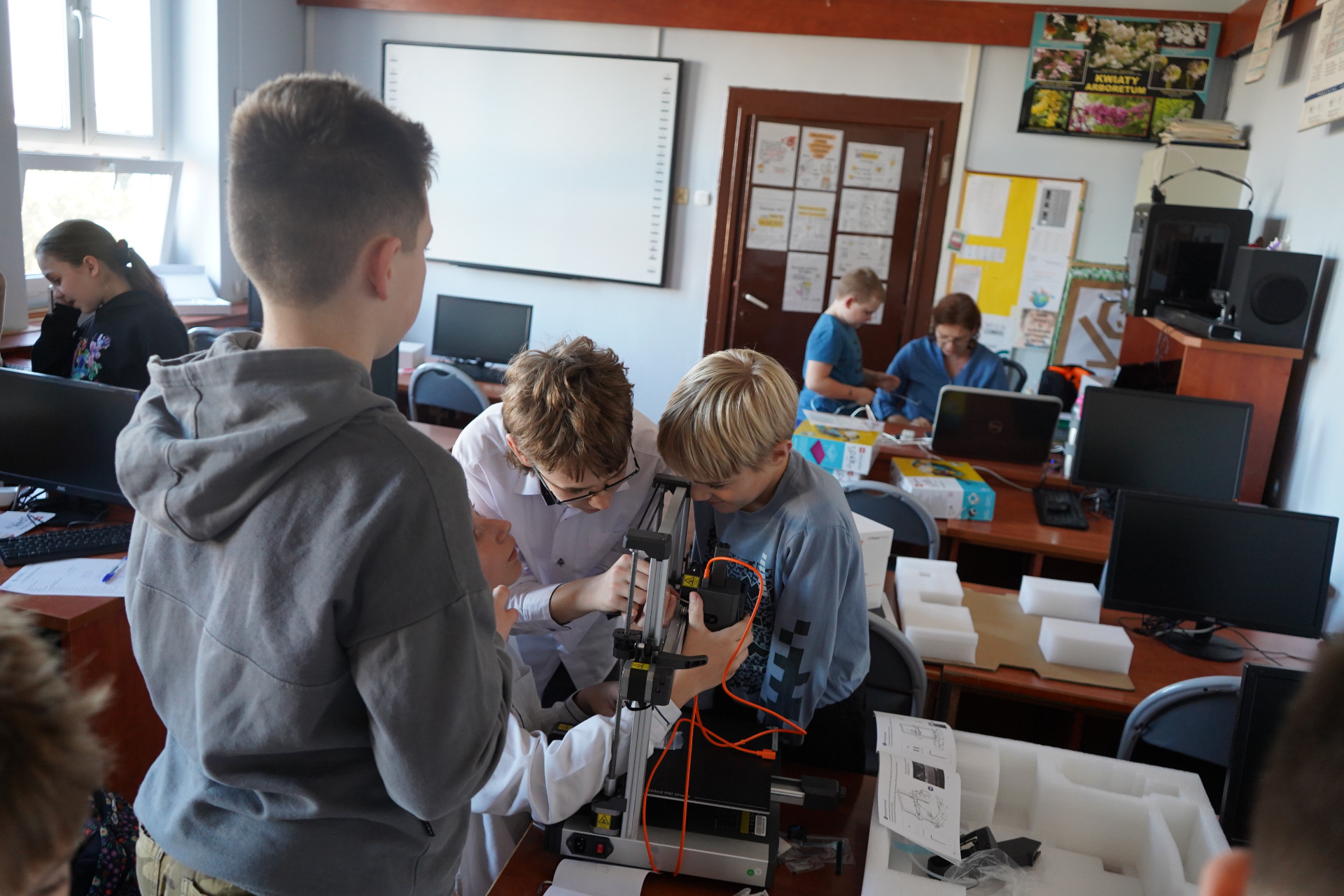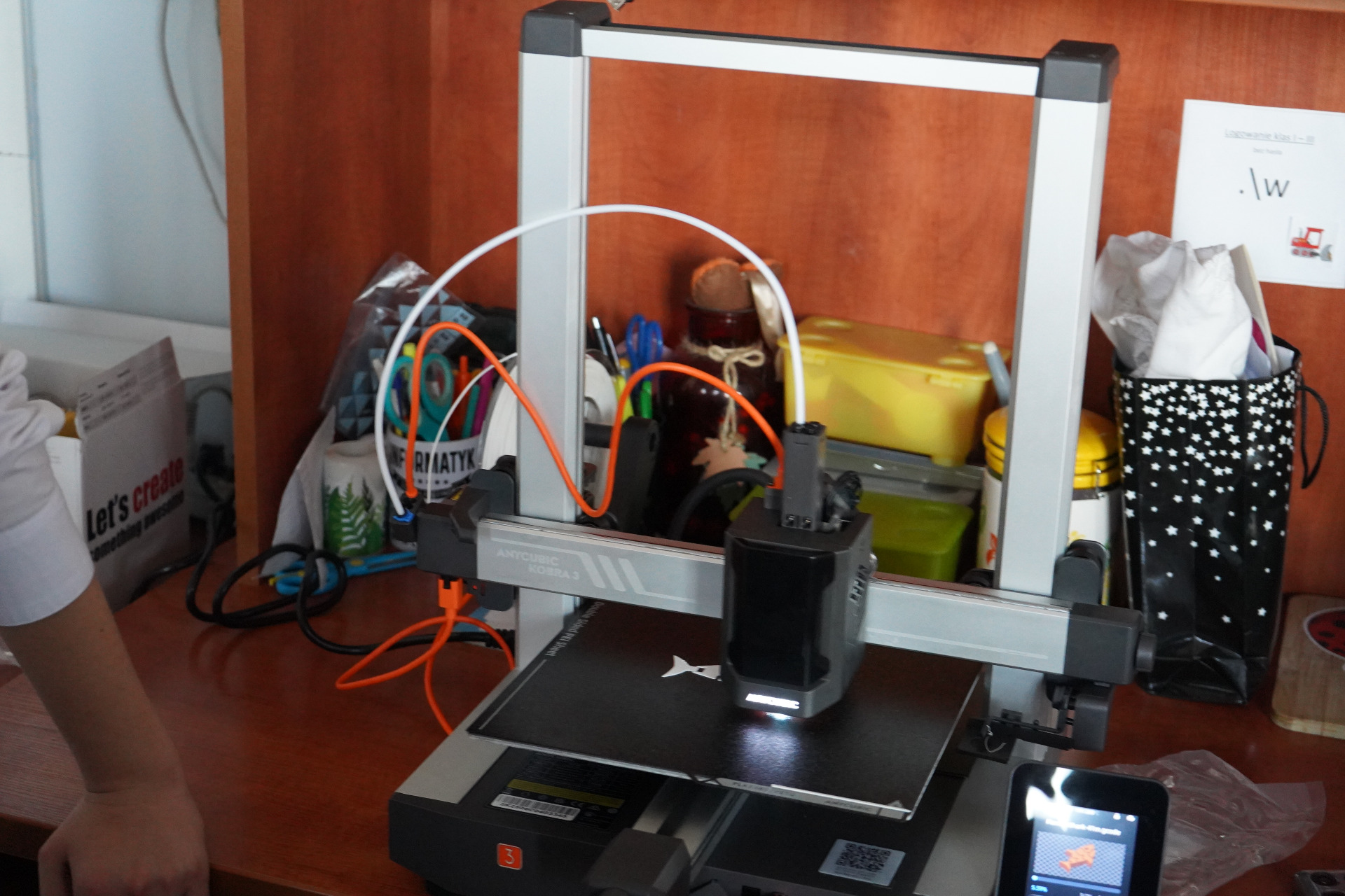 Podczas zajęć uczniowie z klas 6–8 samodzielnie złożyli drukarkę 3D Anycubic Cobra 3, a następnie dokonali pierwszego próbnego wydruku, poznając zasady działania drukarek addytywnych oraz podstawy projektowania trójwymiarowego.